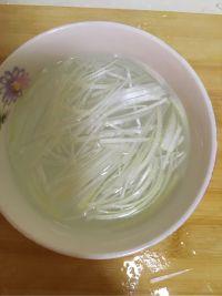 5.放入碗中加入水浸泡,这样葱丝自然就打卷弯曲了。