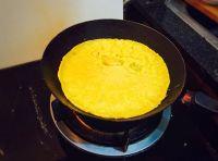 4.平底锅倒入少许油,烧热后加入一大勺鸡蛋淀粉糊,不断晃动平底锅至蛋液凝固,翻面再煎10秒左右即可出锅(如果有气泡不用担心,稍微多煎一会儿就会消失)。